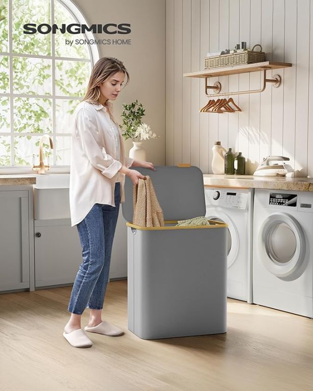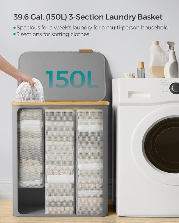 Vychutnajte si poriadok a štýl v každej domácnosti s týmto priestranným 150-litrovým košom na bielizeň. Tri samostatné priehradky vám umožnia ľahko roztriediť bielizeň a ušetriť čas pri praní. Elegantný sivý dizajn s bambusovým rámom sa perfektne hodí do každého interiéru a veko zaisťuje diskrétnosť a ochranu pred prachom.