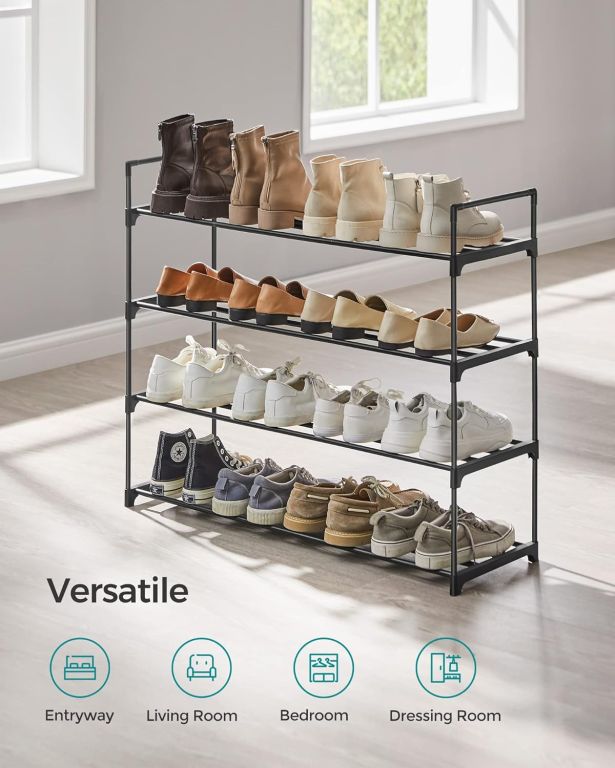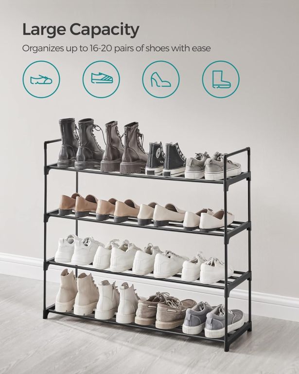 Vytvorte si domov bez neporiadku a užite si pohodlie, kedy máte všetky topánky prehľadne usporiadané. Moderný čierny botník so štyrmi poschodiami ponúka dostatok miesta pre celú rodinu a vďaka svojmu dizajnu sa hodí do každej miestnosti.