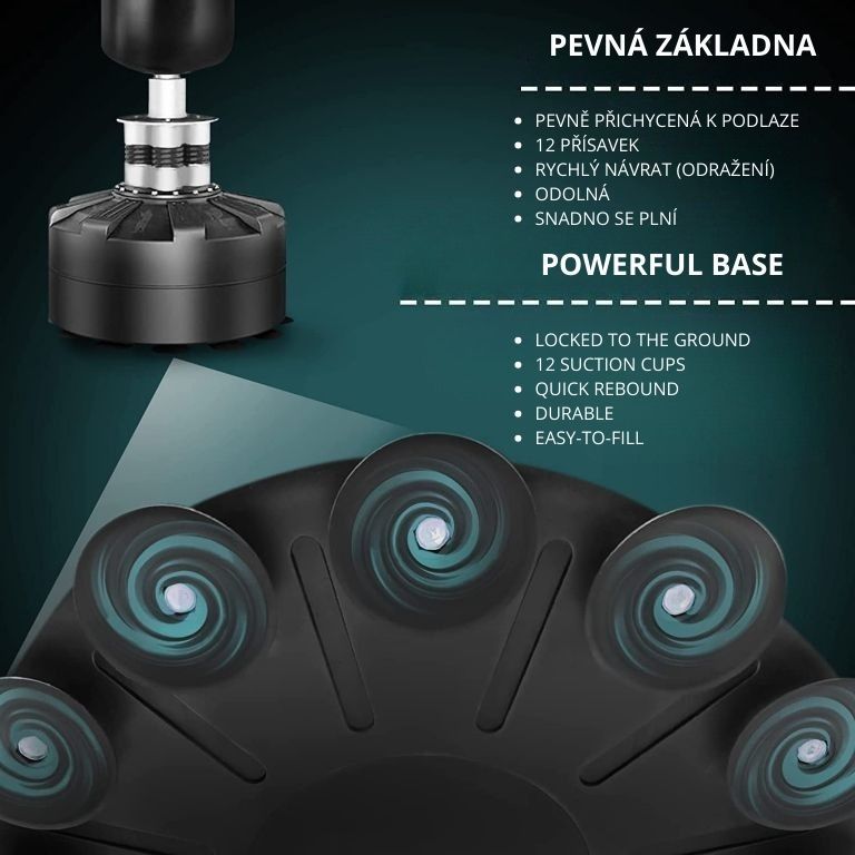 Masívna základňa s 12 prísavkami a možnosťou naplnenia vodou či pieskom zaručuje maximálnu stabilitu aj pri silných úderoch. Pružinový mechanizmus so štyrmi oceľovými pružinami zaisťuje realistický odpor a rýchly návrat vreca do pôvodnej polohy. Boxovacie vrece je ručne šité z odolnej PU kože a nylonu, čo garantuje dlhú životnosť a komfortný tréning bez nutnosti montáže na stenu alebo strop.